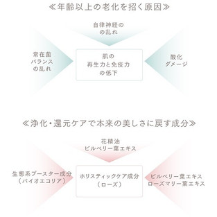 この3つの原因を花精油やオーガニックハーブ、高機能な植物抽出成分を組み合わせた浄化・還元の2ステップでアプローチし、心身両面に働きかけていきます。 現代の環境の中で受けてしまうダメージから解放するステップ「浄化」と、本来の力を取り戻すことを助ける「還元」の2ステップで自分自身が持つ本来の美しさに還ります
